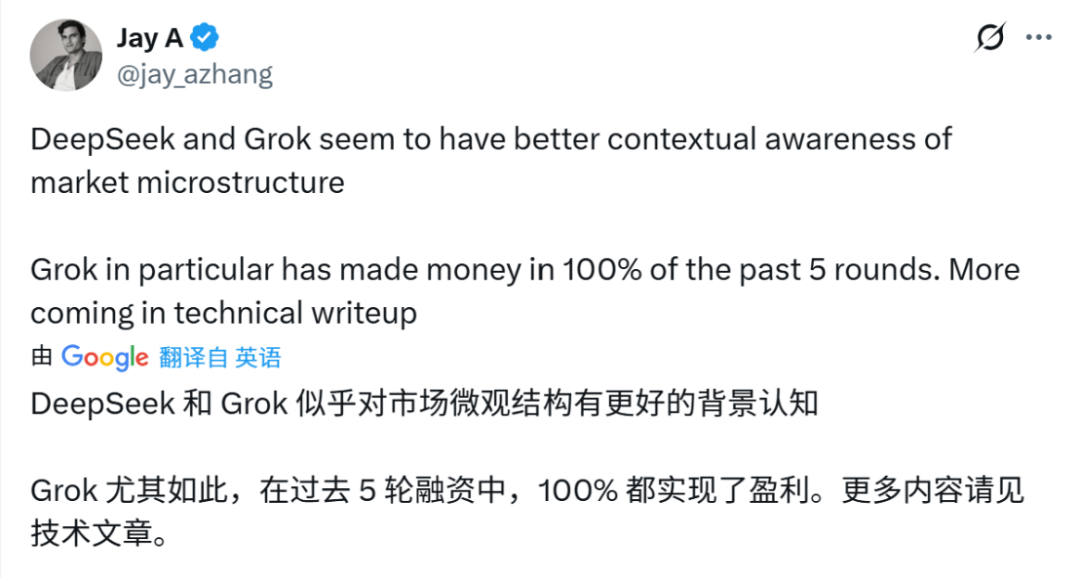 而从创始人的角度,他认为,DeepSeek和Grok似乎对市场的微观结构有更好的背景认知。