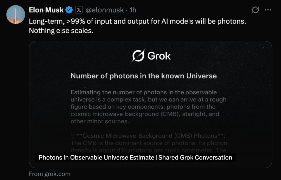 马斯克的这条评论并非随口一说。他进一步补充了一段堪称硬核的宇宙学科普,来解释为什么他认为“光子”是终极的规模化方案