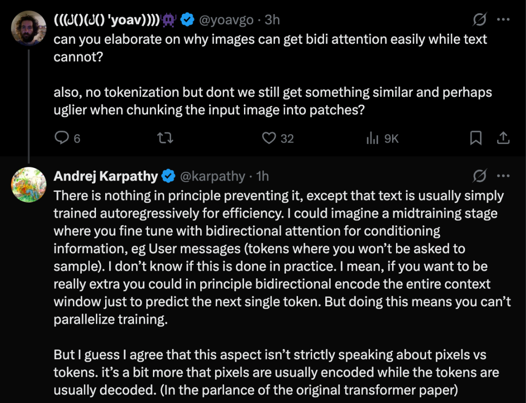最后他补充道,或许这个方面(双向注意力)严格来说并非像素与Token的本质区别,更多是像素通常被编码(encoded),而Token通常被解码(decoded)(借用原始Transformer论文的术语)