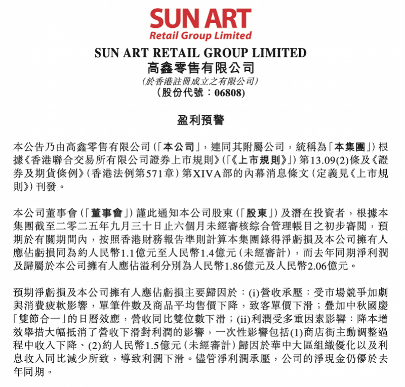 10月20日,大润发母公司高鑫零售发布盈利预警公告。公告显示,截至2025年9月30日的六个月,高鑫零售预计录得净亏损及股东应占亏损为1.1亿元至1.4亿元,去年同期净利润及归属股东应占溢利分别为1.86亿元和2.06亿元。