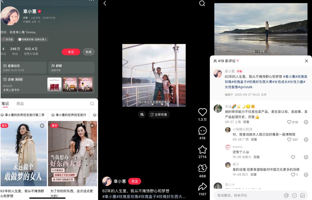 不难发现,而今小红书平台上的热销商品,大多与人格化买手或主理人IP深度绑定。更直白一点说,在小红书,商品卖得好,颇重要的一点是将待售商品融入一个可信赖的人格化叙事之中,如章小蕙将“永远做个敢做梦的女人”笔记置顶,这条笔记主要讲述她的人生经历与创业故事,高赞评论称她不仅在卖产品,也是在卖认知和故事。
