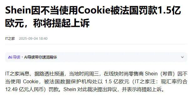 但就在之前,SHEIN却遭到了法国监管机构CNIL的针对,说要对SHEIN处以1.5亿欧元罚款,原因是该公司未能遵守有关访问网站放置cookie的规则。