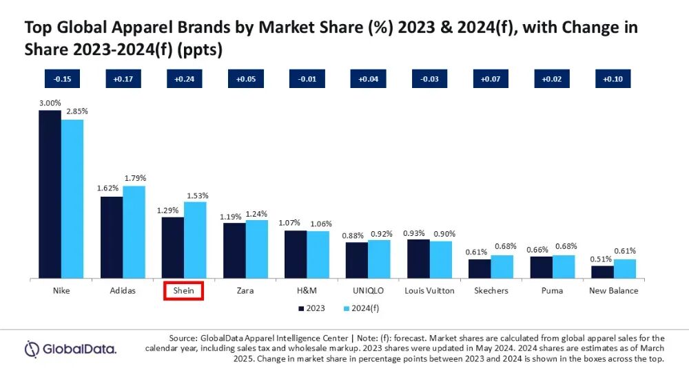 市场研究机构GlobalData的报告也显示,SHEIN在2024年已成功跻身全球第三大时尚零售商,与ZARA、H&M等传统快时尚巨头并驾齐驱。