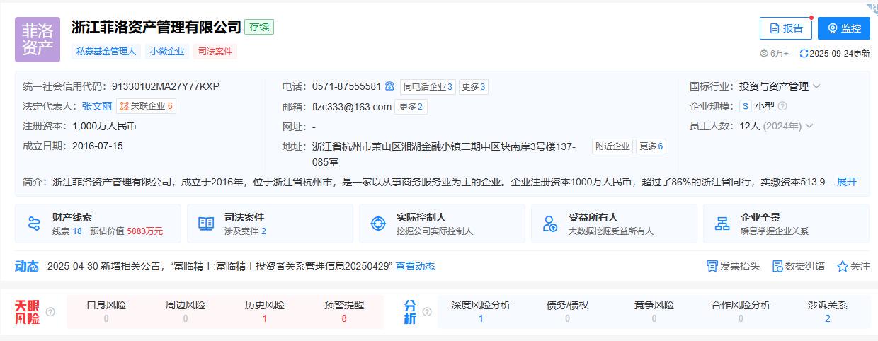 天眼查网站显示,菲洛资产目前共有1条历史风险,8条预警提醒。(中新经纬APP)