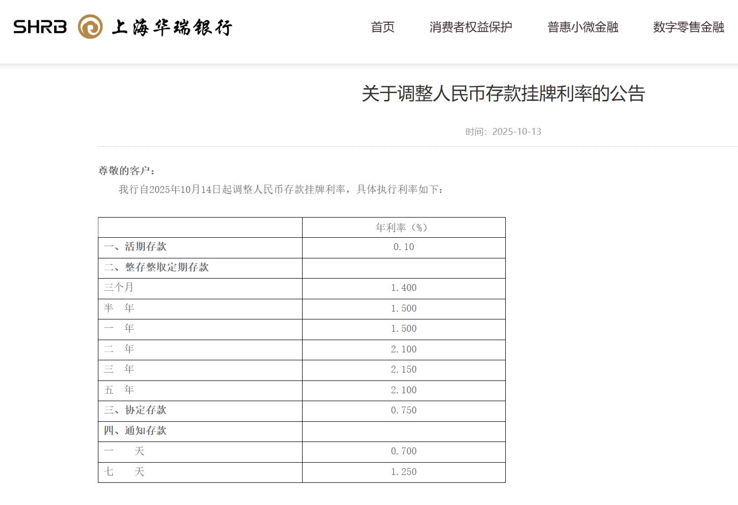 10月13日,上海华瑞银行发布《关于调整人民币存款挂牌利率的公告》,将3年期整存整取定期存款利率从2.3%调降至2.15%。而就在9月末,该行才刚刚下调过3年期、5年期定期存款利率。