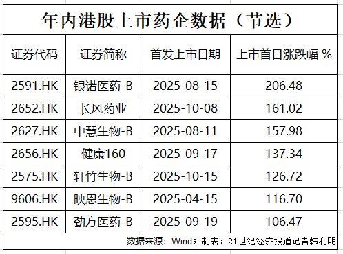 港股市场方面,今年创新药企“上岸潮”持续升温。21世纪经济报道记者梳理Wind医疗保健板块数据显示,年内已有21家企业登陆港交所,且多家新上市药企首日表现亮眼。例如银诺医药首日涨跌幅高达206%,映恩生物、中慧生物、劲方医药、长风药业、轩竹生物等企业首日涨跌幅均超105%。