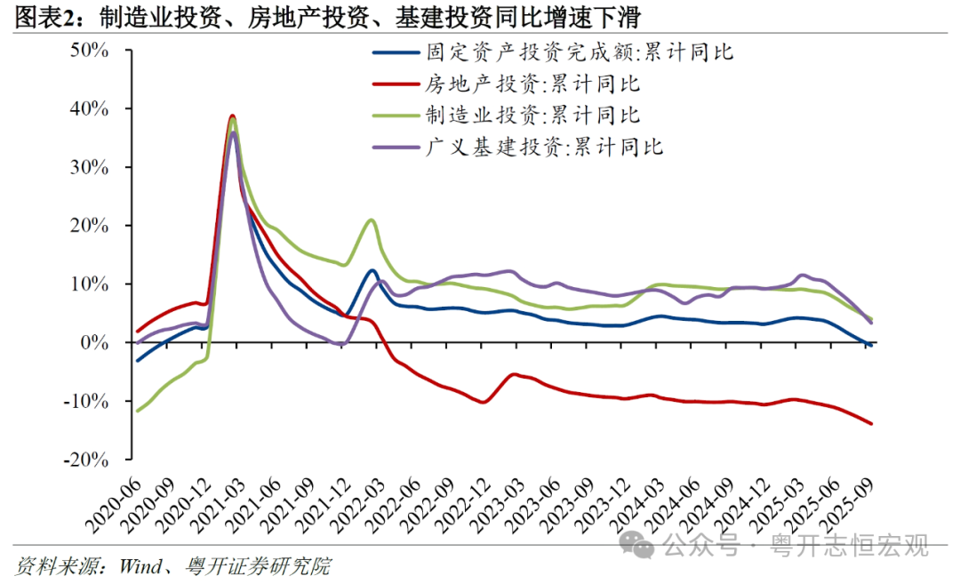 其四,制造业投资从高速增长逐步回落。一是制造业设备更新空间收窄,1-9月设备投资同比由一季度19%的高点持续回落至14%。二是“反内卷”政策有利于改善供需失衡问题,但客观上部分行业推进产能去化,也就是相关行业投资放缓,1-9月电气机械和器材制造业(包含光伏和锂电池等细分行业)投资累计同比为-9.5%。三是终端消费需求不振以及外需后续可能受到的冲击,抑制了企业投资信心和意愿。