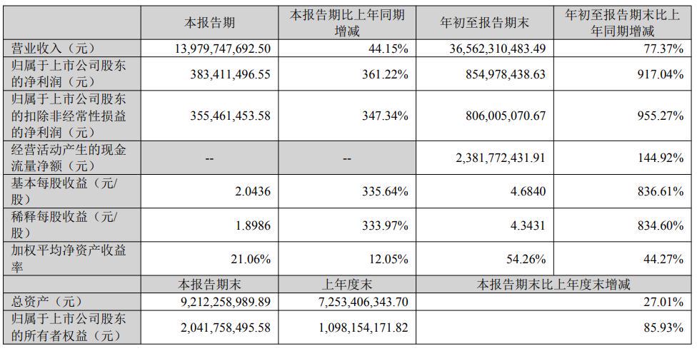 万辰集团21日披露财报显示,前三季度营业收入365.62亿元,同比增长77.37%;净利润8.55亿元,同比增长917.04%。第三季度,公司实现营收139.80亿元,同比增长44.15%;实现净利润3.83亿元,同比增长361.22%。
