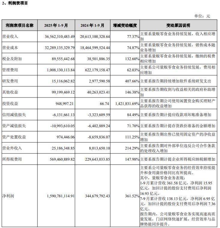 万辰集团同时披露,1-9月量贩零食业务累计营收361.58亿元,净利润15.95亿元,加回计提的股份支付费用后净利润16.93亿元。7-9月量贩零食业务累计营收138.13亿元,净利润6.95亿元,加回计提的股份支付费用后净利润7.36亿元。