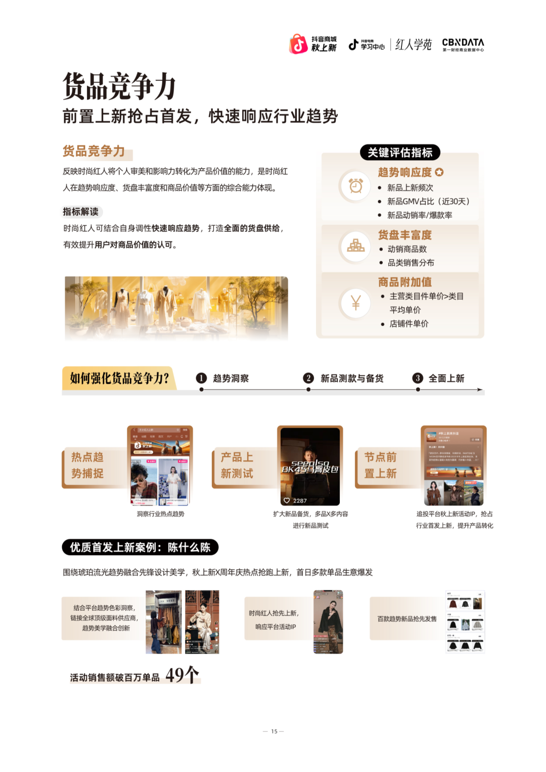 围绕抖音商城「秋上新」“琥珀流光”趋势,时尚红人商家@陈什么陈 快速响应,将全球顶级面料与先锋设计相结合,抢跑市场。其强大的货品竞争力得到充分验证,活动期间销售额破百万的单品达49个。