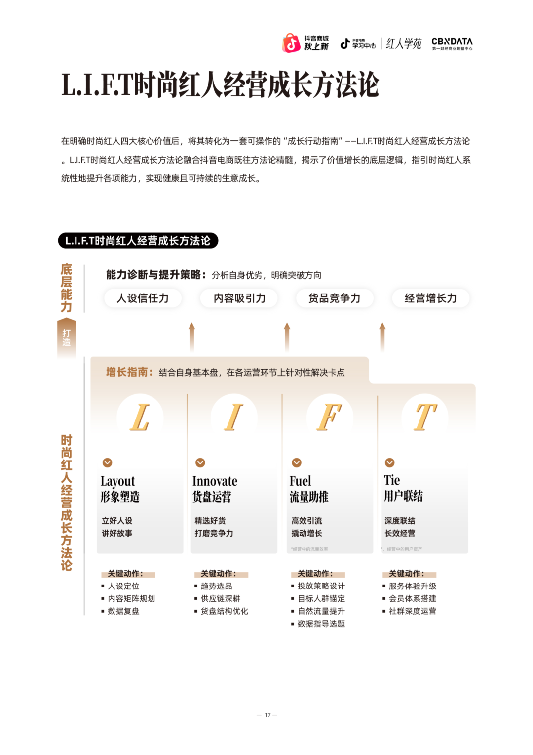 通过“四力模型”的能力建设和L.I.F.T时尚红人经营成长方法论的落地执行,时尚红人可以在抖音电商生态中实现可持续的商业增长,完成从内容创作者到时尚红人商家的本质蜕变。