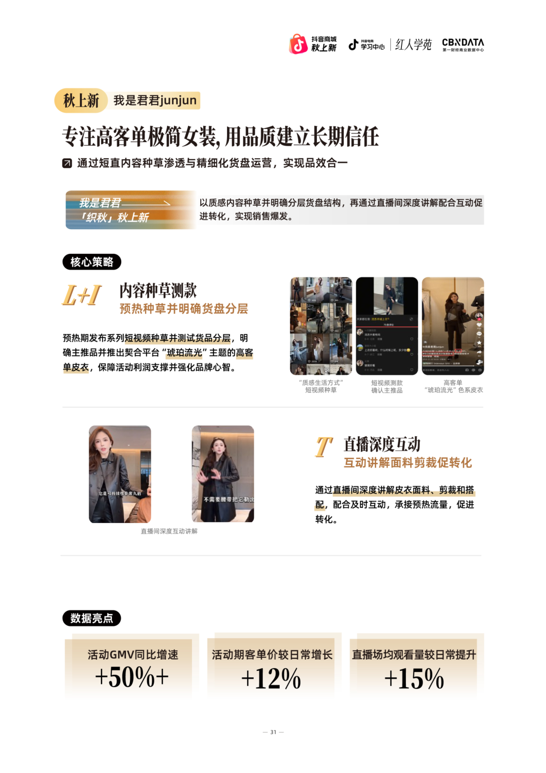 在「秋上新」活动中,君君通过系列短视频进行内容种草,明确分层货盘角色,精准测试市场反应。直播间内,通过深度讲解皮衣面料、剪裁工艺等专业内容,配合即时互动,有效提升转化效率。这场活动最终实现直播间观看量较日常提升15%,印证了其“内容种草测款+直播深度互动”模式在高客单市场的可行性。