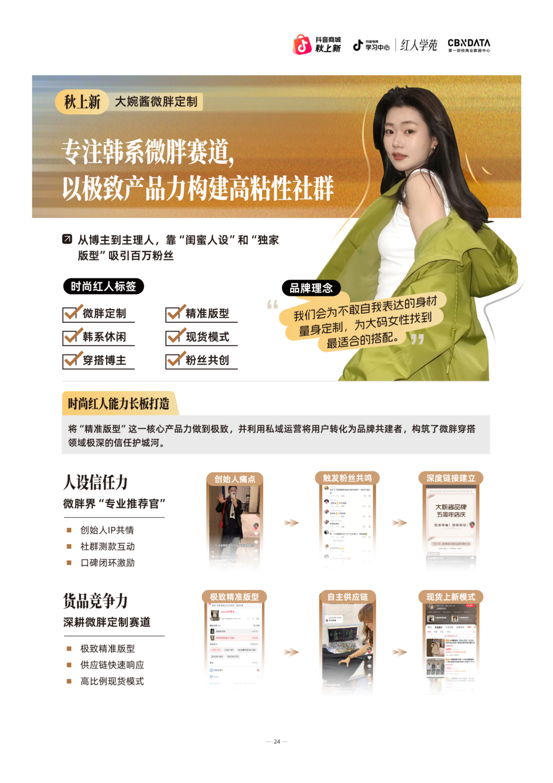 专注韩系微胖垂类赛道五年的@大婉酱,成功开辟出女装红海中的蓝海市场。其核心在于将特定人群的穿搭痛点转化为产品解决方案,展现出人设信任力与经营增长力的有机结合。