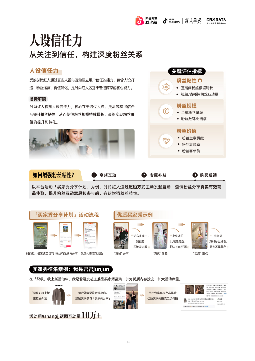 在四力模型中,人设信任力是最关键的突破能力,也是促成深度转化的桥梁。时尚红人通过真实人设与深度互动建立用户信任,实现粉丝粘性、粉丝规模、粉丝价值等关键维度的增长,而做好粉丝粘性是提升人设信任力的关键,商家可通过高频互动、专属补贴和购买反馈等方式提升用户粘性。例如,女装时尚红人@我是君君junjun通过“买家秀分享计划”激发粉丝参与,形成“真诚分享-真实体验-实用观点”的信任闭环,形成高粘性、高复购的私域资产。