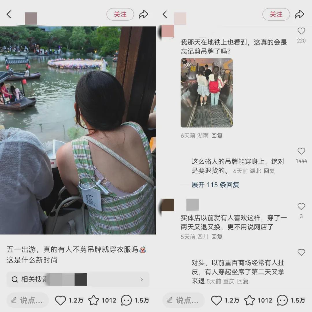 网友吐糟遇到穿着不剪吊牌衣服的游客,假期还没结束,商家就收到了带着汗渍、口红印或是粉底液的退货衣服,“五一白嫖党”的讨论迅速引发了无数人的共鸣和声讨。