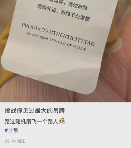 早在今年3月份,有消费者在小红书上发帖称,自己买的衣服上有巨无霸吊牌。吊牌大到可“随机扇飞一个路人”。