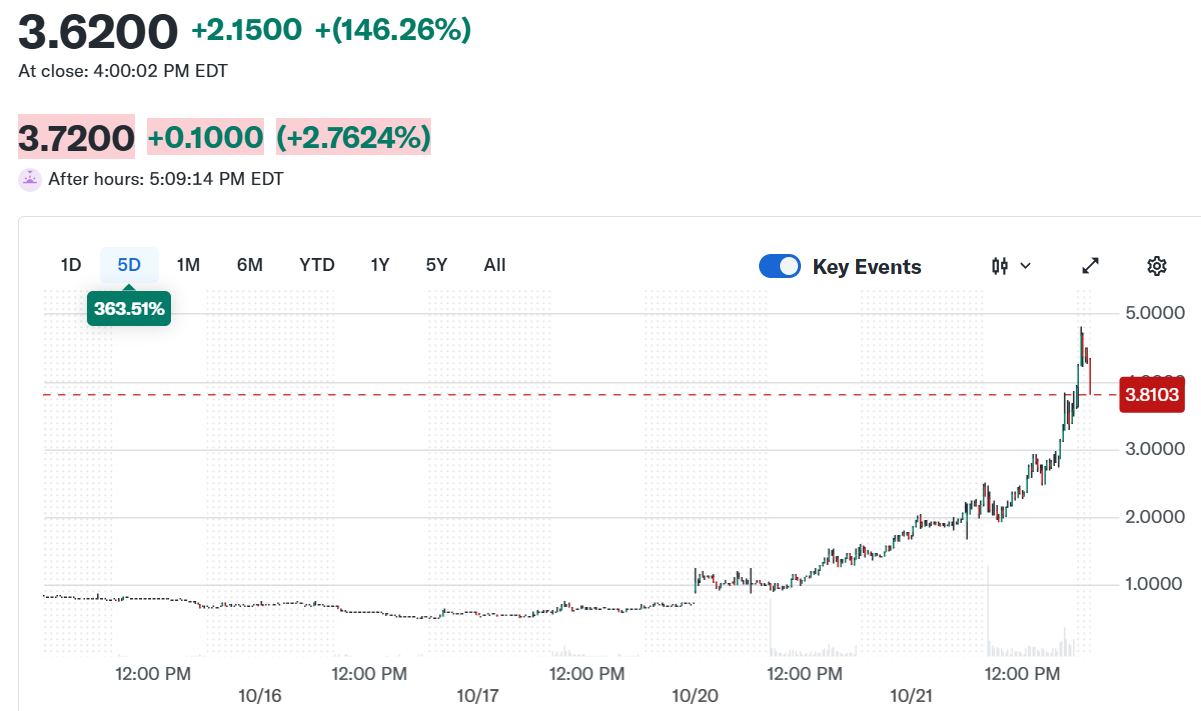 Beyond Meat最近三个交易日的累计涨幅大约达到600%。截至周二收盘,Beyond Meat股价位于每股约3.6美元的水平,而上周收盘时仅为65美分、最低一度达到50美分。