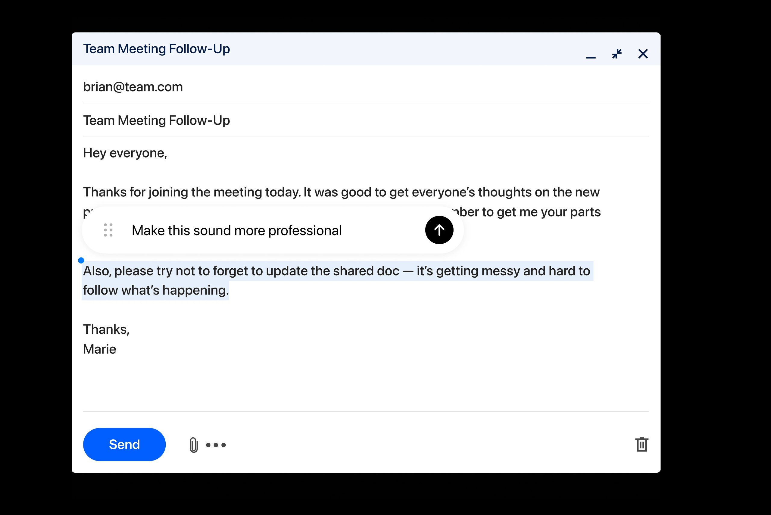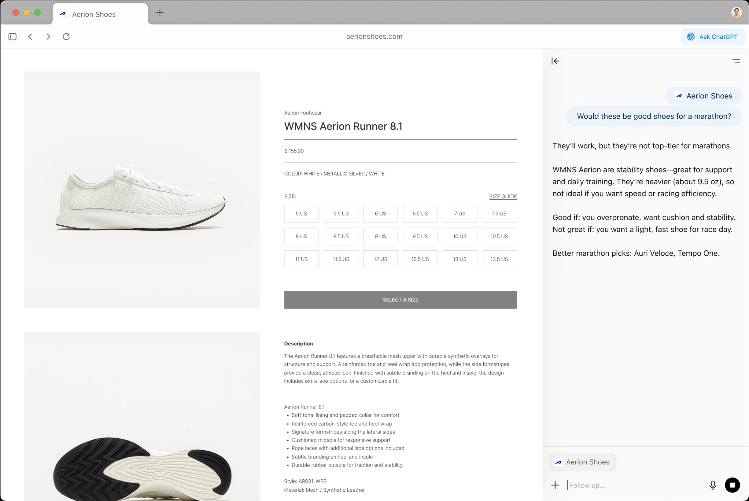 在Atlas中,每当你点击搜索结果的链接时,默认会显示分屏界面:左侧是网页,右侧是ChatGPT对话记录。这样设计的目的是让AI“助手”始终伴随在旁。用户也可以关闭分屏模式。员工在直播中还展示了浏览器的网页摘要功能,以及如何在邮件中选中一句话并点击按钮让ChatGPT即时润色的功能——这一特性被称为“光标聊天(cursor chat)”。