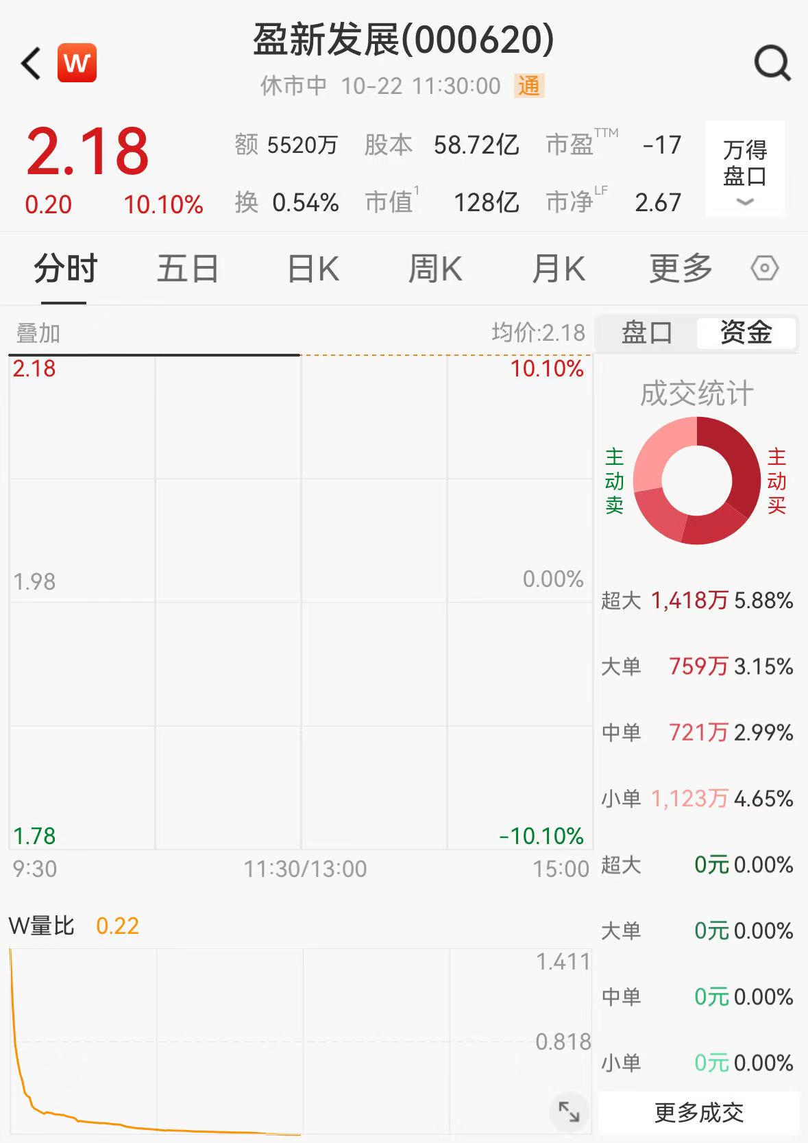 10月22日,盈新发展开盘继续涨停,斩获三连板,报2.18元/股,总市值128亿元。