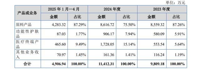 按业务划分,安华生物的收入主要来自原料产品、功能性护肤品、医疗终端产品及其他业务。