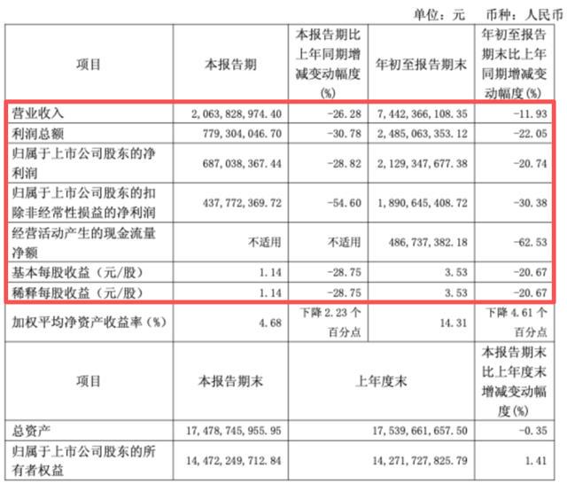 这场下跌的直接导火索,是上周五发布的一份揭示内在危机的三季报。报告显示,公司前三季度营收74.4亿元,同比下降11.93%;归母净利润21.29亿元,同比下降20.74%。更为关键的是,净利润降幅显著大于营收,这背后是其核心盈利能力的急剧恶化——第三季度扣非净利润同比腰斩54.6%,而非经常性损益的“粉饰”与投资收益的异常暴增,共同构成了这份成绩单的底色。这份财报不仅暴露了公司短期业绩压力,更引发了市场对其盈利质量与增长可持续性的深度担忧。