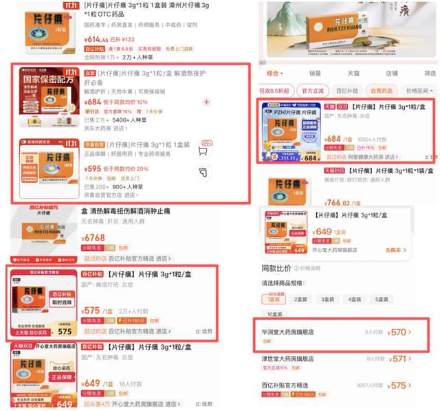一个值得关注的现象是,片仔癀的渠道价格体系已出现松动。《华夏时报》记者观察到,尽管官方定价保持不变,但在“双十一”期间,非官方渠道的实际售价较官方价格低出近30%。以主流平台为例,京东大药房的“片仔癀3g*1粒”售价为684元,而京喜自营官方店价格低至595元。淘宝平台上,阿里健康大药房价格也低至684元/粒,买的越多折扣越多,采购20盒及以上可低至640元/粒。部分“百亿补贴”店铺价格低至575元/粒。有的店铺甚至出现570元/粒的售价。终端零售价击穿官方定价,直接反映出公司对市场价格的管控正面临严峻挑战。