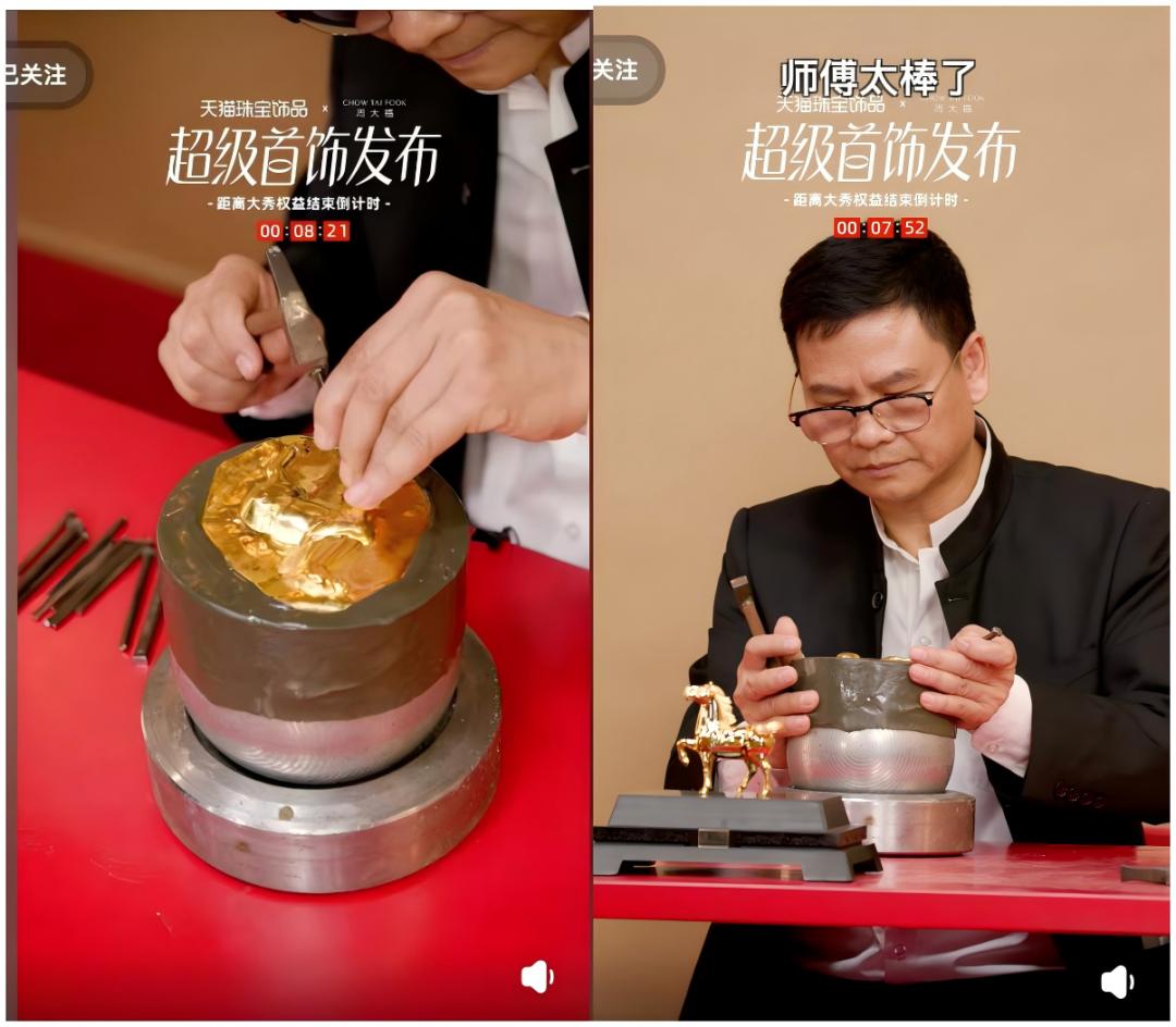比如在双11这样的关键大促节点上,六小时直播里周大福没有刻意卖货,反而是领着观众见证手艺人一锤一錾敲打出“策马奔腾”,了解玲珑花蝶、福蝶知春等经典系列背后的设计故事,因此意外吸引了诸多打金爱好者和传统文化爱好者的关注。