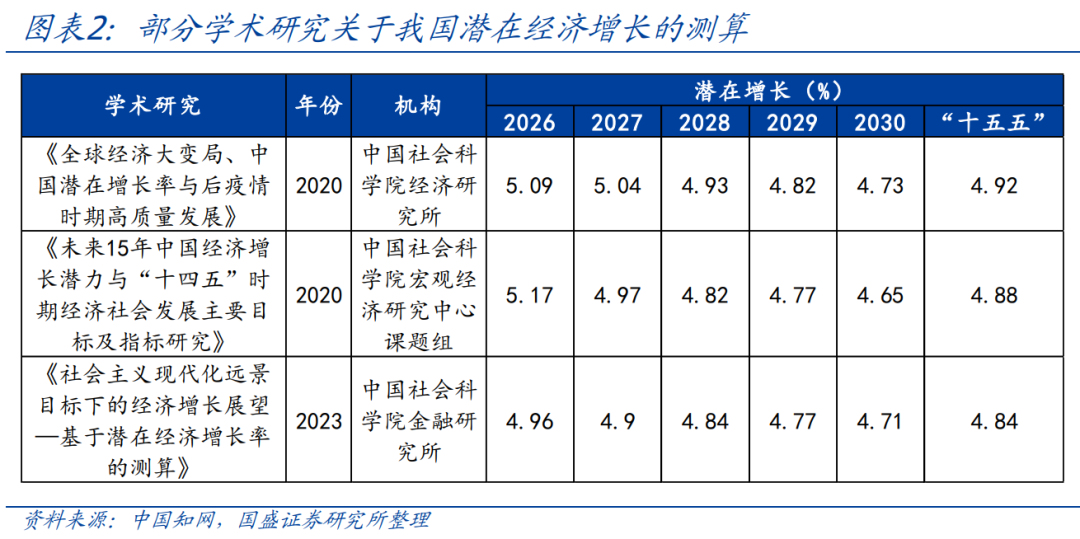 >潜在经济增长角度,多数学术研究测算认为“十五五”期间我国潜在GDP增速仍有4.8-4.9%左右。如张晓晶,汪勇(2023)应用增长核算模型,并考虑人口老龄化加速、新冠疫情冲击与中美技术脱钩等“三大新因素”,测算得出2026-2030年我国GDP潜在增速为4.71%-4.96%,“十五五”期间平均4.84%左右。