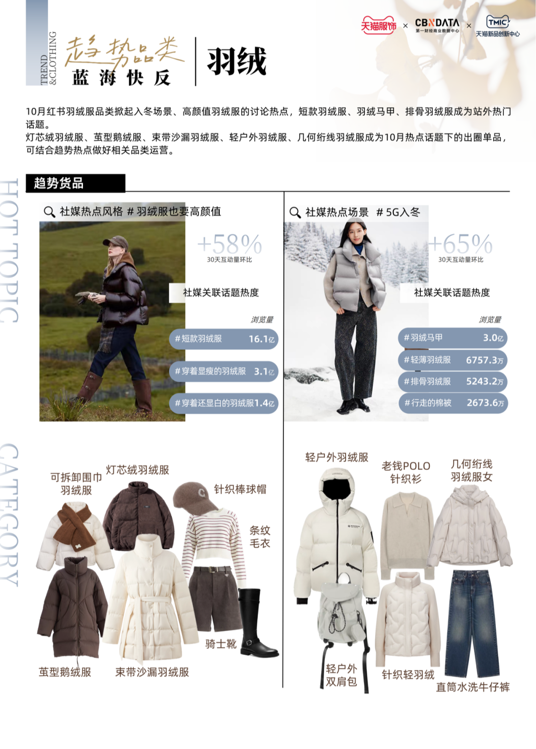 轻盈保暖的云朵泡芙羽绒服、复古飒爽的人造革皮衣、细腻高级的静奢羊毛衫、软糯亲肤的超柔软家居服......这些趋势单品勾勒出10月服饰趋势热点。除了对于上述四大重点趋势品类的解析,《报告》还基于社交媒体热度、市场消费规模以及供需状况,聚焦女装、男装、男女鞋、箱包配饰等品类,围绕细分趋势赛道,提供服饰消费的前瞻性动态。