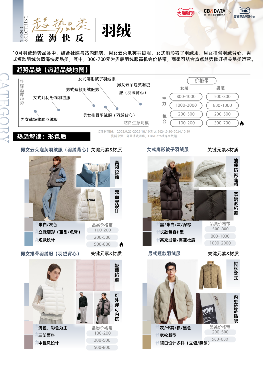 围绕风格演变与季节转换,羽绒、皮衣皮草、毛衫、保暖内衣/家居服成为10月重点趋势品类。面对平台双十一大促带来的潜在客群、流量曝光与季节转换带来的热趋风格、全新需求,品牌亟需精准洞察趋势货盘,关注云朵泡芙羽绒背心、人造皮革衣、静奢羊毛衫、超柔软家居服等潜力单品,并围绕风格矩阵完善趋势运营,抓住确定性的生意增长机会。
