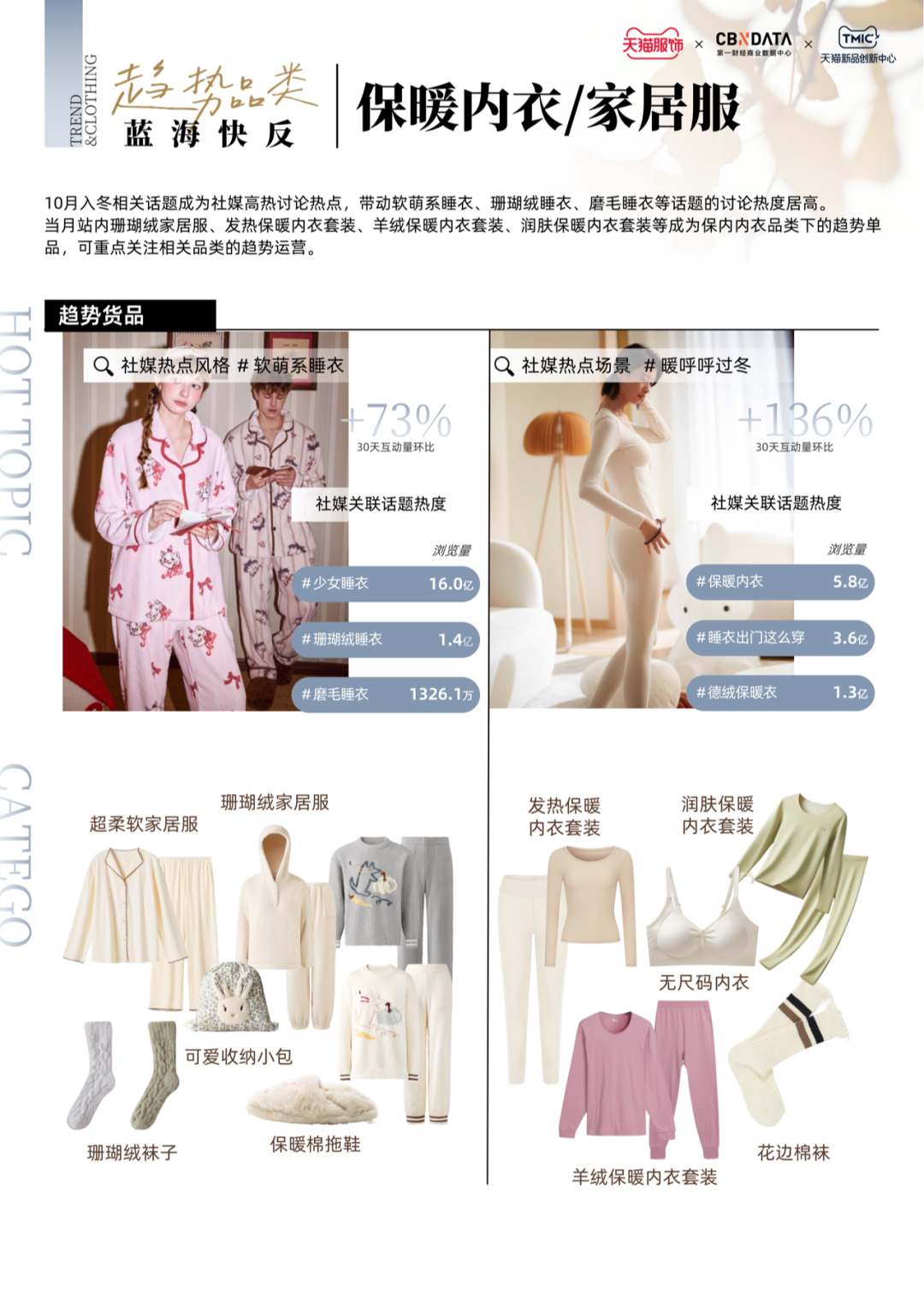 保暖内衣/家居服板块,超柔软家居服、蕾丝小腿袜、发热肌底衣等兼具舒适度与美观性的蓝海快反品类热度走高,站内外关注度持续提升。消费者在追求亲肤温暖的同时,也愈发重视居家着装的审美表达与情绪共鸣。
