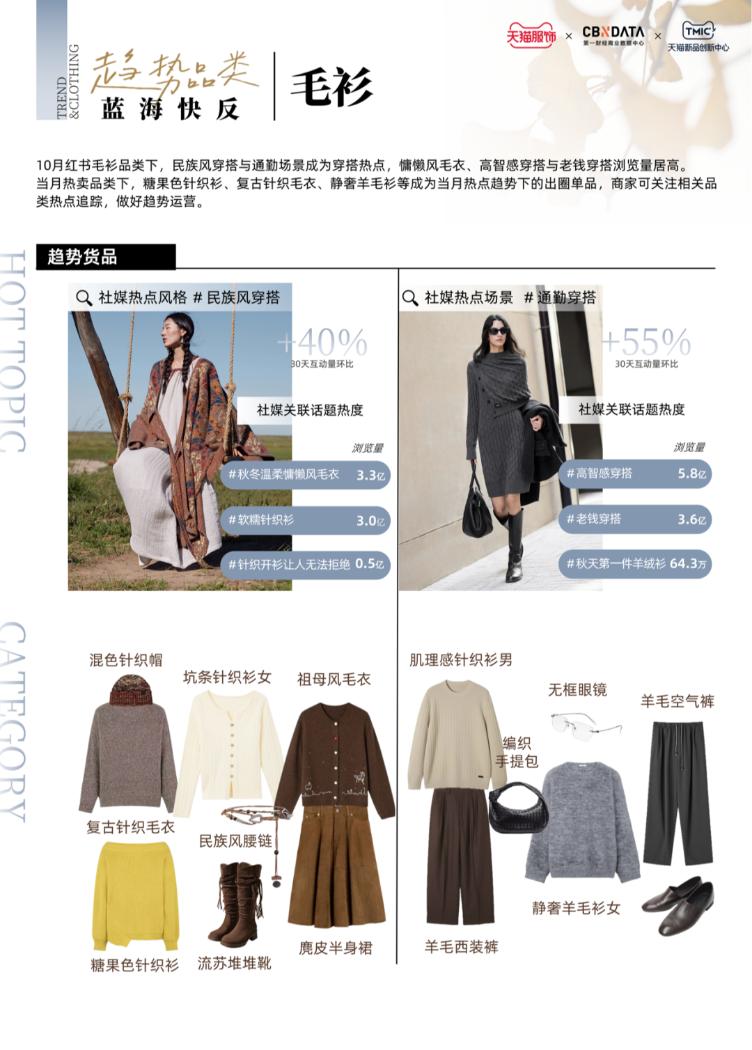 基于此,第一财经商业数据中心(CBNData)联合天猫服饰共同发布《天猫服饰10月刊:趋势解码·上新日历》(下称《报告》),结合服饰四大趋势品类当月表现、热门单品形色质解析与社媒热点风格动向,助力商家厘清双十一备战方向,精准布局秋冬上新。