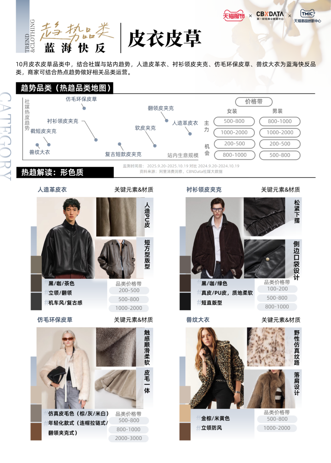 人造皮革衣、衬衫领皮夹克、仿毛环保皮草与兽纹大衣表现突出,跻身皮衣皮草品类蓝海快反之列。人造革皮衣延续经典机车风格,以短方型版型与黑、咖、茶色的经典色谱,营造复古飒爽气质;仿毛环保皮草主打仿真皮毛色与连帽、翻领等年轻化设计,持续吸引新一代消费者;兽纹大衣更是凭借金棕、米黄等自然色调与立领防风设计,成为本季值得关注的个性单品。