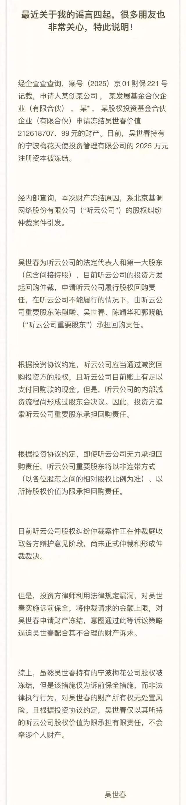从吴世春的声明中得知,本次财产冻结,主要源于北京基调网络股份有限公司(简称“听云公司”)的股权纠纷仲裁案件。