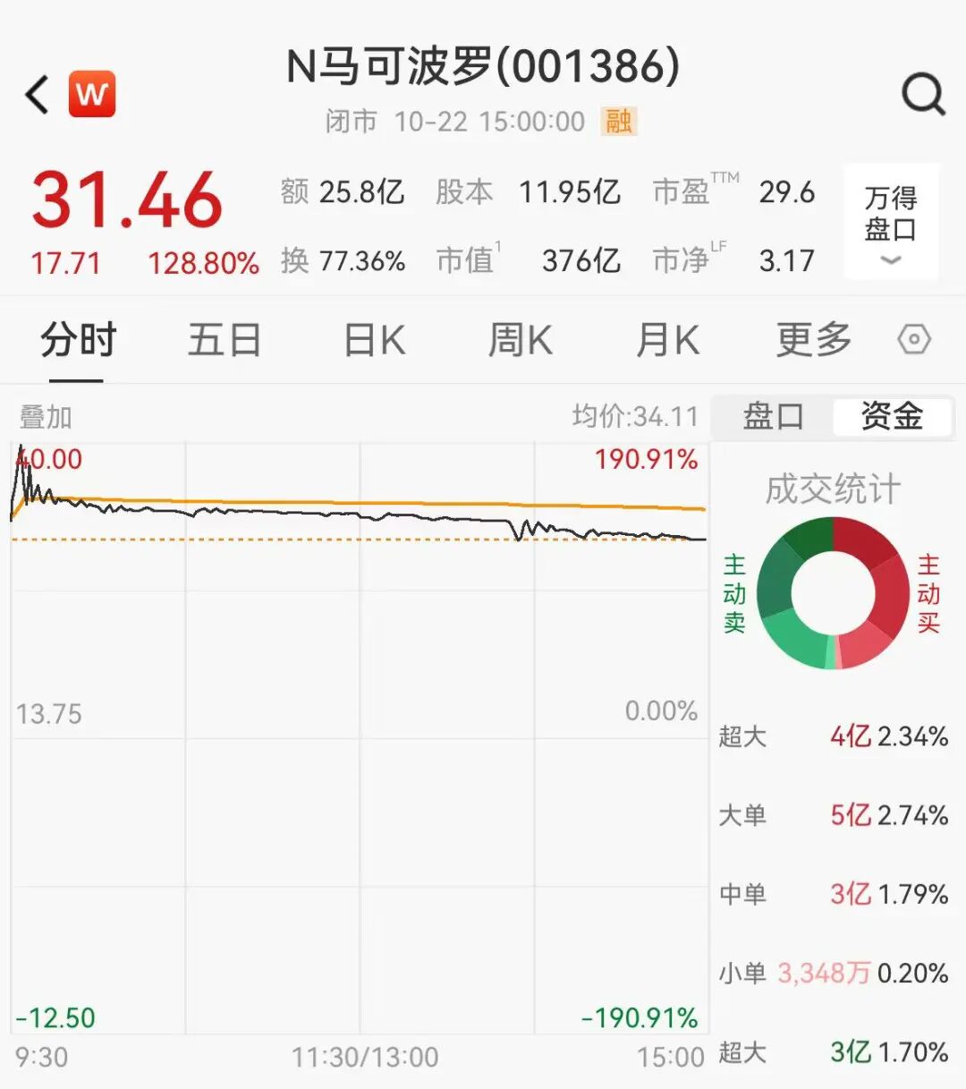 10月22日上午,马可波罗控股股份有限公司(以下简称马可波罗)在深圳证券交易所挂牌上市,截至当天收盘,马可波罗涨超128%,股价升至31.46元,总市值达376亿元。