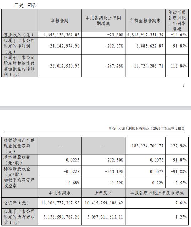 22日,石化机械披露财报显示,前三季度,公司实现营收48.19亿元,同比降14.62%;实现净利润688.56万元,同比降91.85%。单看第三季度,公司实现营收13.43亿元,同比降23.60%;实现净利润-2114.30万元,同比变动为-212.37%。