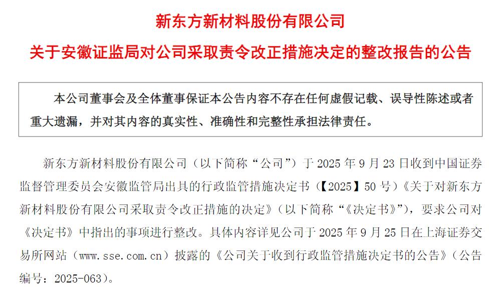 东方材料称,公司于2025年9月23日收到中国证券监督管理委员会安徽监管局出具的行政监管措施决定书(【2025】50号)《关于对新东方新材料股份有限公司采取责令改正措施的决定》(以下简称“《决定书》”),要求公司对《决定书》中指出的事项进行整改。公司于2025年10月22日召开公司第六届董事会第十四次会议,审议通过了《关于安徽证监局对公司采取责令改正措施决定的整改报告》。实施的具体整改措施及完成情况如下:
