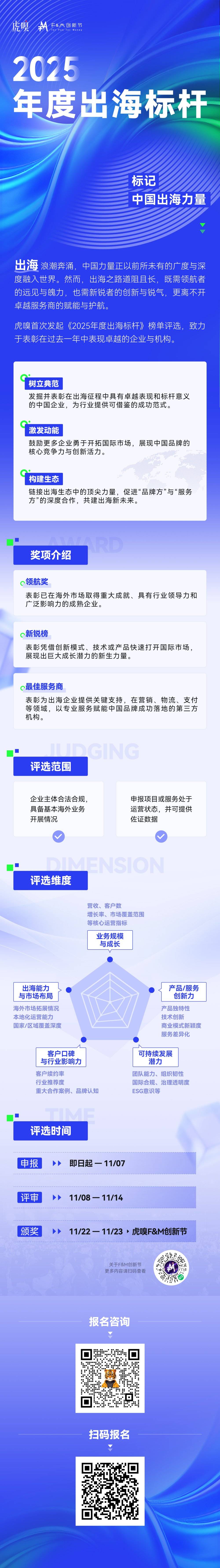 虎嗅出海即将推出的《2025出海标杆榜单---最佳服务商子榜》,正是希望通过系统的评估和深度的调研,帮助更多出海企业找到真正优秀的服务商伙伴,选对企业隐形的合伙人。可自荐/提名,5大维度评选,解锁行业交流与荣誉时刻,点击⬇️,立即参与。