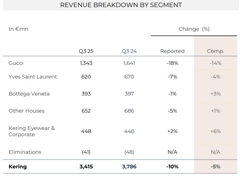 财报显示,三季度,开云的主力品牌古驰(Gucci)贡献集团将近四成营收,当季同店销售降幅较二季度收窄超四成,且降幅略低于分析师预期。圣罗兰(YSL)的同店销售降幅环比收窄过半,葆蝶家的同店销售加快增长。