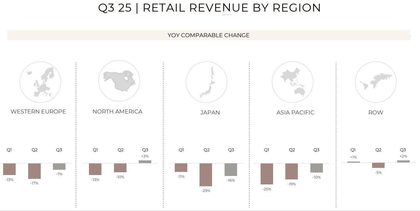 在开云的主要市场中,三季度北美表现最好,同店销售扭转了今年前两个季度两位数下滑的势头,恢复正增长。西欧的同店销售较二季度降幅收窄将近六成。日本的同店销售从二季度的将近30%收窄到20%以内,中国等其他亚太地区的同店销售下降10%,环比二季度几乎收窄一半。