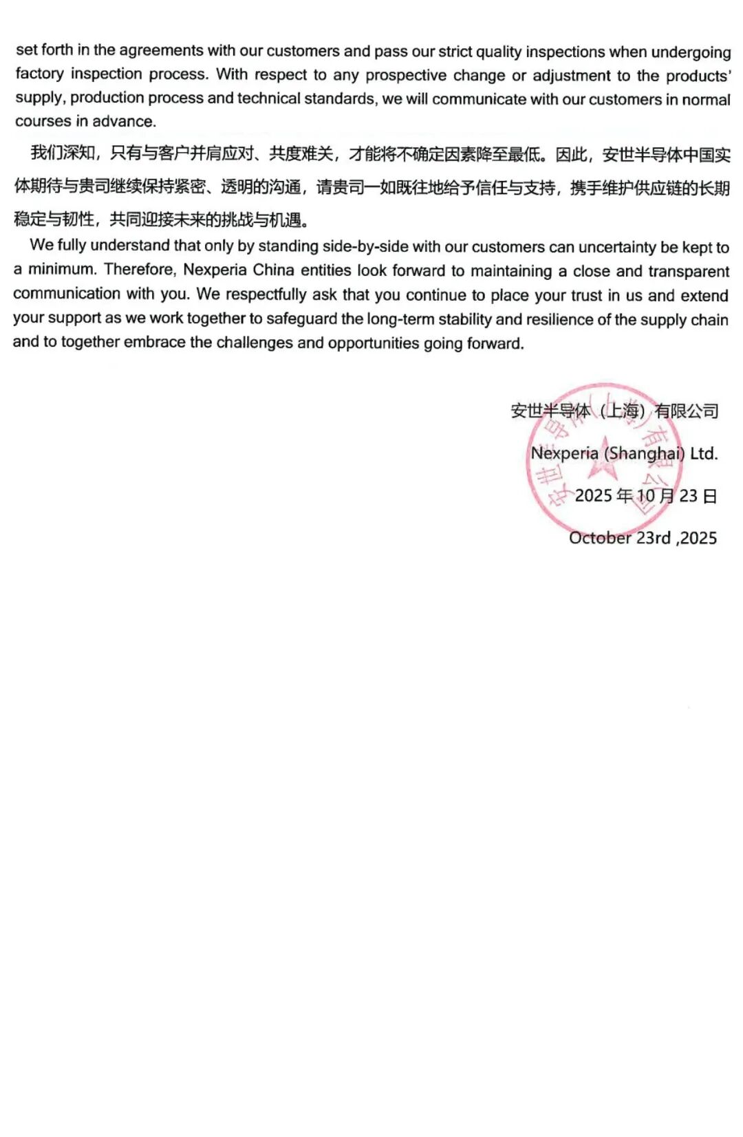 刚刚,安世半导体中国实体致信客户,称其作为中国企业合规独立运营,正保障客户供应链稳定;反对荷兰安世管理层干扰经营、散布不实信息并将依法维权,同时承诺在华产品合规达标,愿与客户紧密沟通、共护供应链稳定。