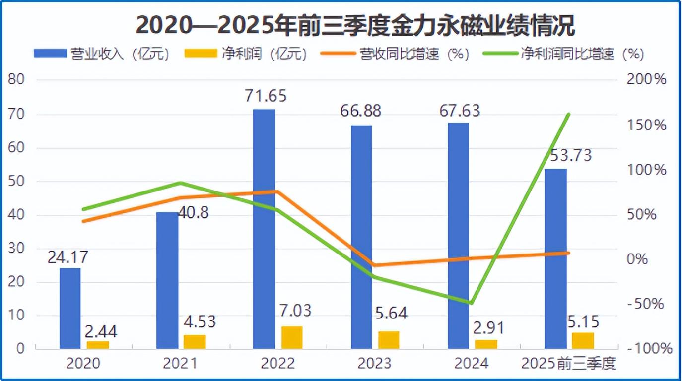 2025年前三季度,金力永磁实现营收53.73亿元,同比增长7.16%;实现净利润5.15亿元,已远超2024年全年水平,扣非净利润同比增速更是飙到381.94%。