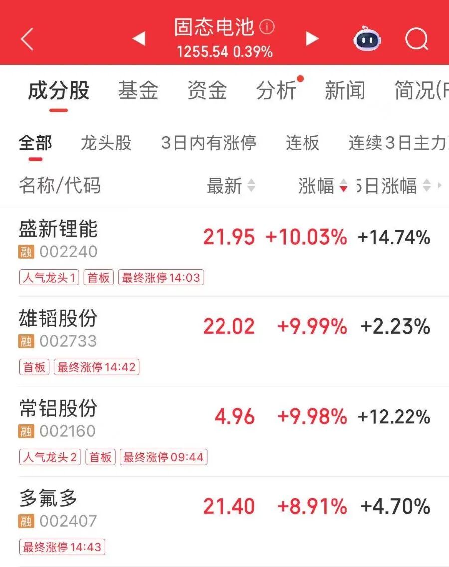 固态电池概念股早上一度下跌1.75%,午后爬升,收盘时上涨0.39%,其中盛新锂能(002240.SZ)、雄韬股份(002733.SZ)、常铝股份(002160.SZ)、多氟多(002407.SZ)涨停,欣旺达(300208.SZ)涨1.71%。