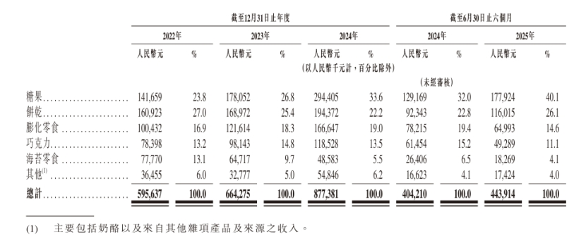 IP趣玩食品是金添动漫的主营业务,即IP+零食。截至2025年6月30日,金添动漫在全国建有5大生产基地、拥有26个授权IP及超过600个活跃SKU,包括糖果、饼干、膨化零食、巧克力、海苔零食五大产品类别。