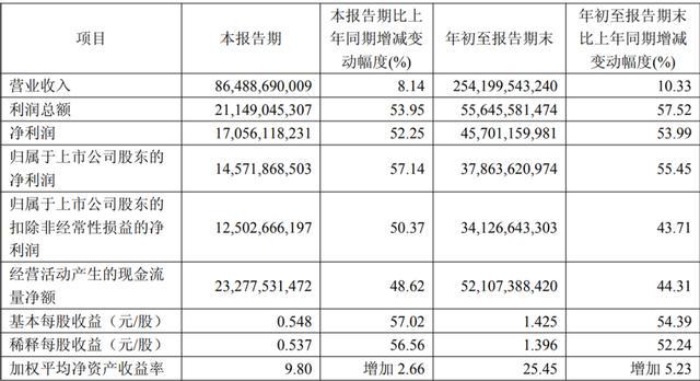 前三季度营收2542亿,同比增长10%,归母净利润379亿,同比大增43.7%。