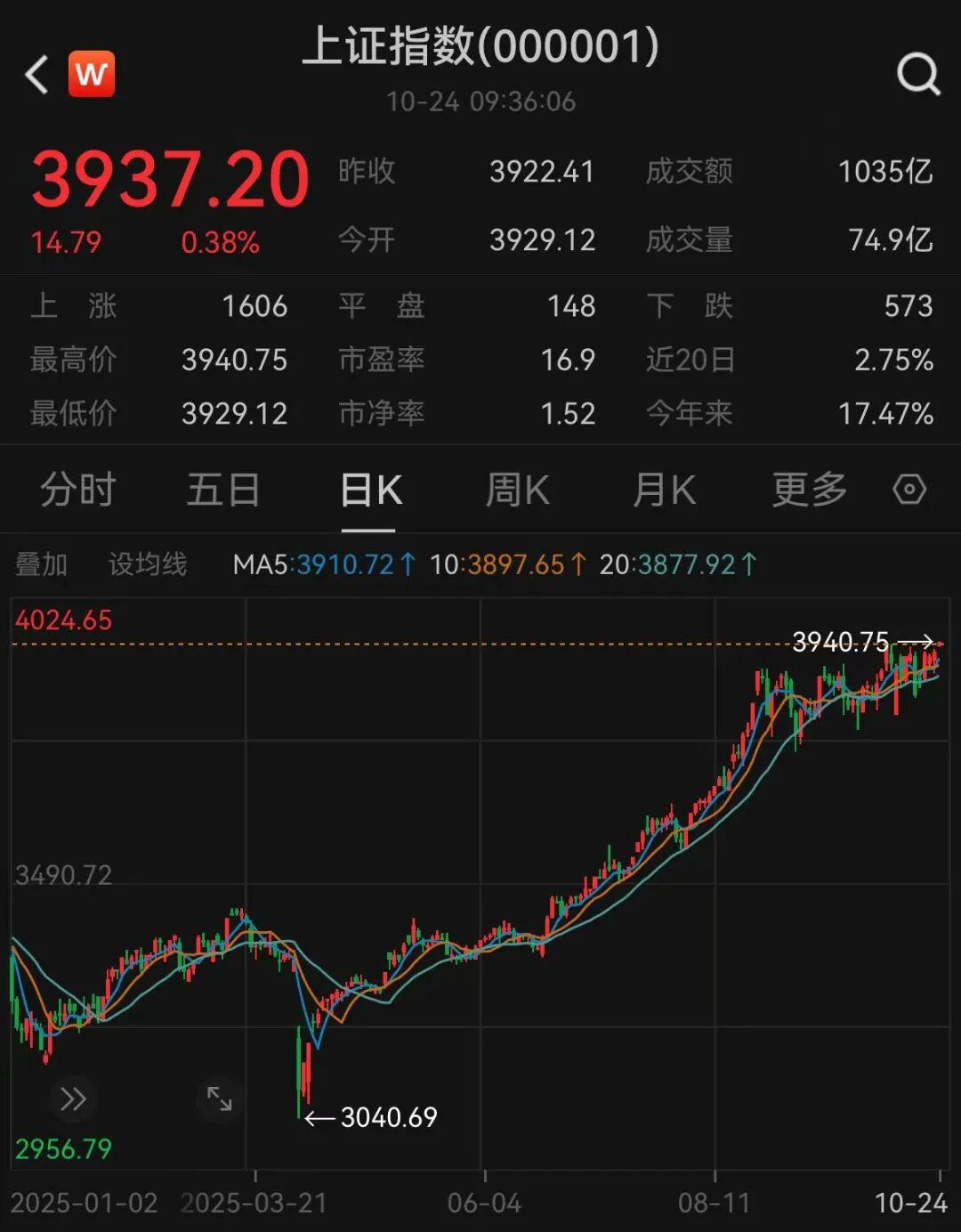 10月24日,A股三大指数高开高走,沪指突破前期高点,再创十年新高;创业板指突破3100点整数关口,涨1.24%;深证成指涨超1%。