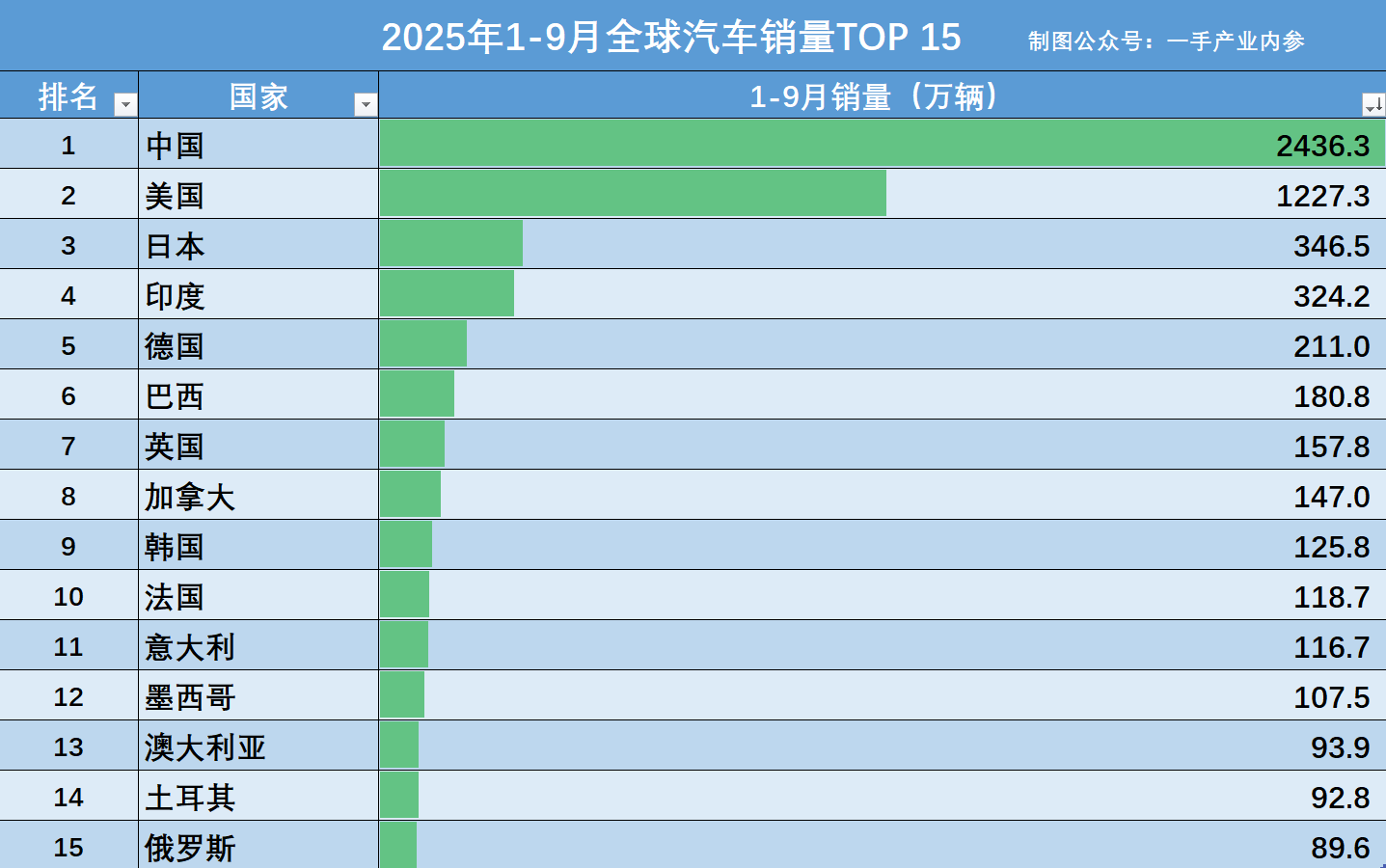 另附:2025年1-9月全球汽车销量15强国家,数据源于:中汽数研。