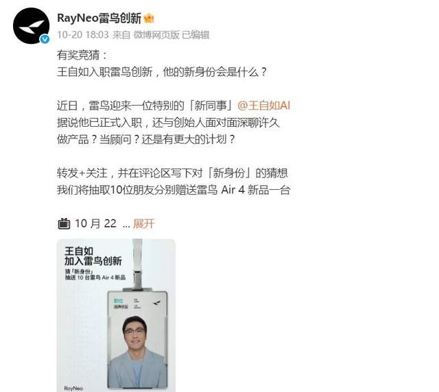 10月20日晚,智能眼镜品牌雷鸟创新一条微博引发圈内热议,其表示“王自如入职雷鸟创新,他的新身份会是什么?”并还用到了“近日,雷鸟迎来一位特别的「新同事」王自如,据说他已正式入职,还与创始人深聊许久,做产品?当顾问?还是有更大的计划?”成功吊起了网友胃口。