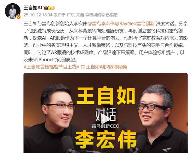 10月22日,王自如趁势打铁,推出了已录制好的播客节目,而这期时长达2小时的深度对话节目的嘉宾,正是雷鸟科技&雷鸟创新的创始人李宏伟,至此,雷鸟和王自如双方一场漂亮的联合营销正式闭环。