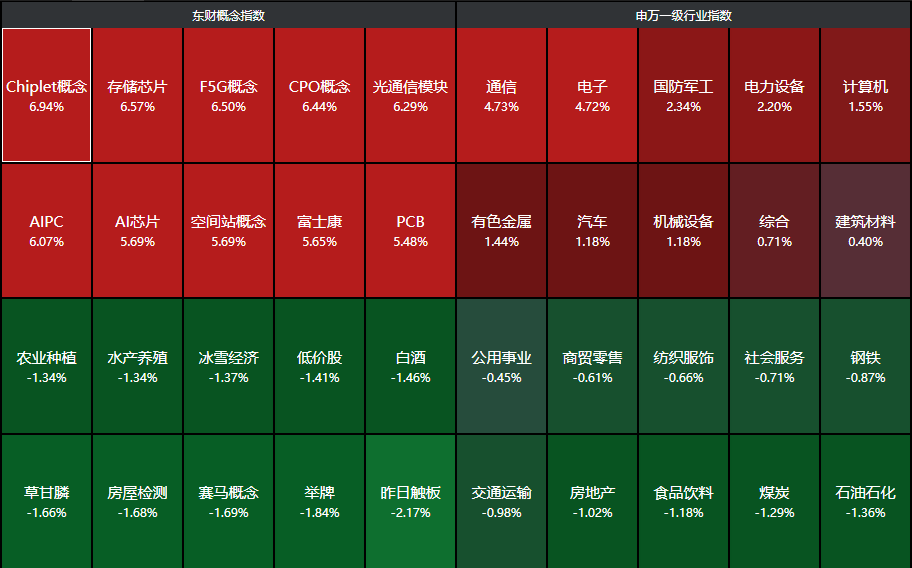 分行业来看,通信、电子、国防军工、电力设备、计算机等行业领涨,石油石化、煤炭、食品饮料、房地产等行业领跌。